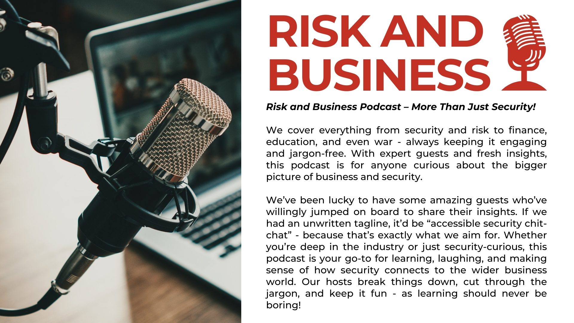 With a perfect mix of industry expertise and sharp humour, Mike Gillespie and Ellie Hurst make the Risk and Business Podcast both insightful and entertaining. While they tackle serious security topics, their natural chemistry ensures there’s always room for a laugh. Security might not be the liveliest subject – but with Mike and Ellie leading the way, you’re guaranteed to walk away informed, engaged, and maybe even laughing.